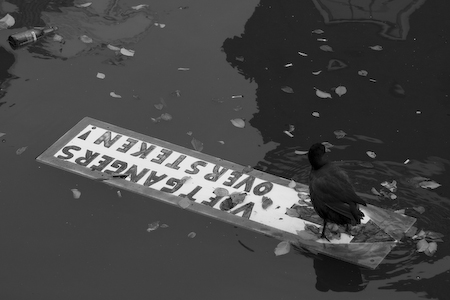 The Duck in the image on the right below is lost in the reflection of the building in the water, while the image on the left, it is clear that the duck and the sign is the subject of the photograph.